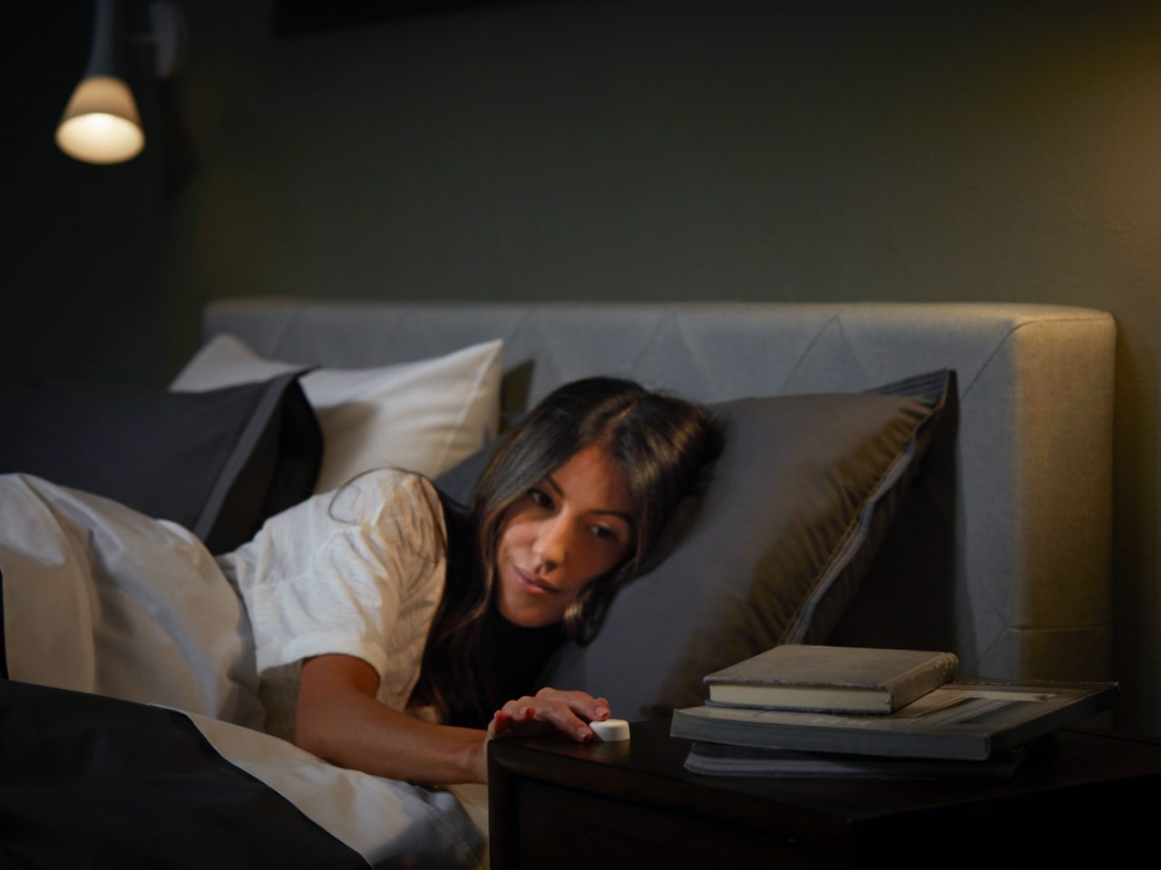 Gute-Nacht-Szene: Ein langer Druck auf den Smart Button neben dem Bett dimmt das Licht über 15 Minuten langsam herunter. So fällt das Einschlafen leichter und es bleibt genug Zeit, noch ein paar Seiten zu lesen.