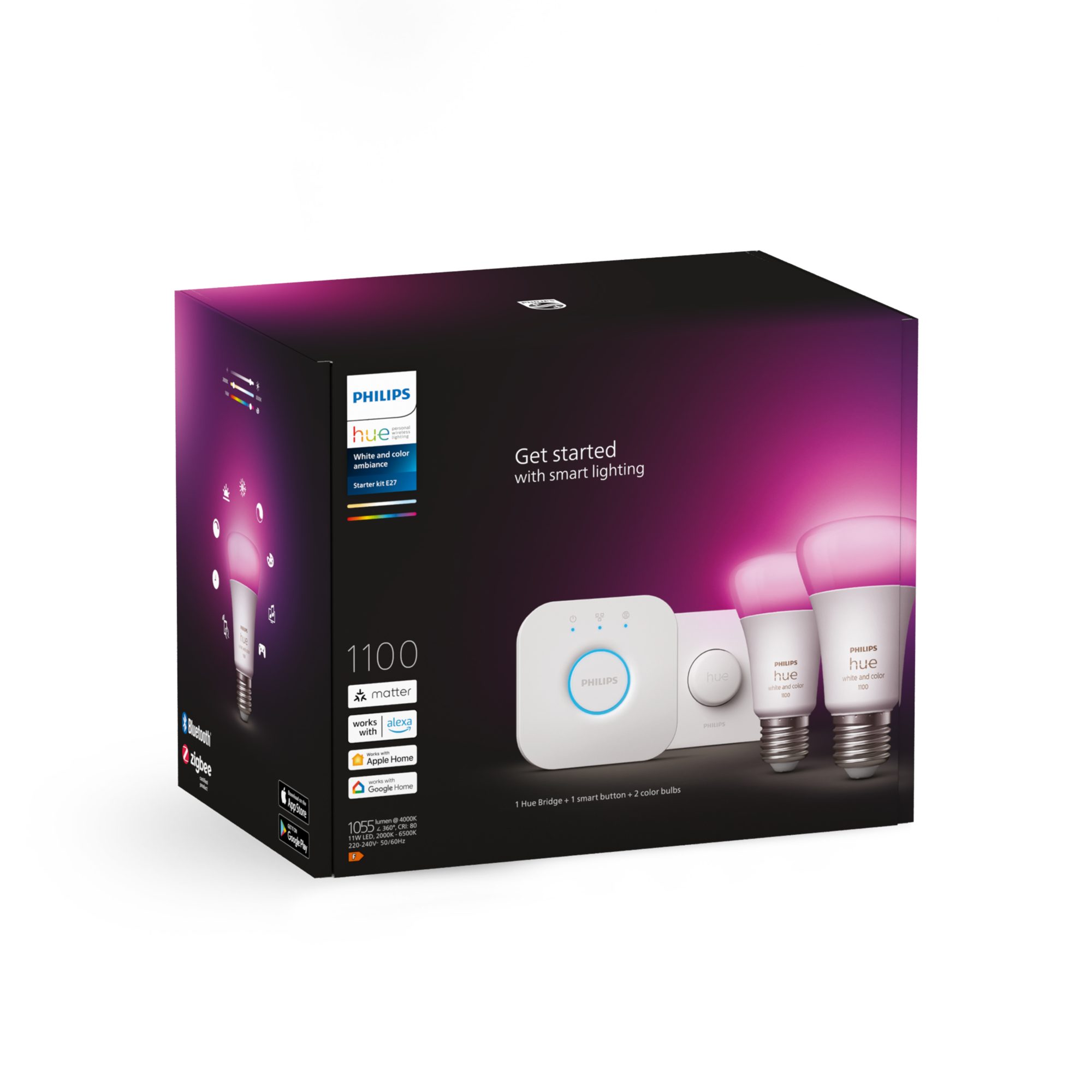 Besonderheiten | Hue Bridge und Smart Button im Lieferumfang enthalten, größtes Zubehör-Ökosystem | 1x E27 Lampe + Dimmer, Günstiger Einstieg | Zukunftssicher durch Thread | 2x E27 Lampe, Günstiger Einstieg, Musiksynchronisierungs-Modus |